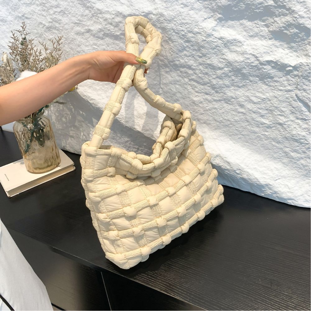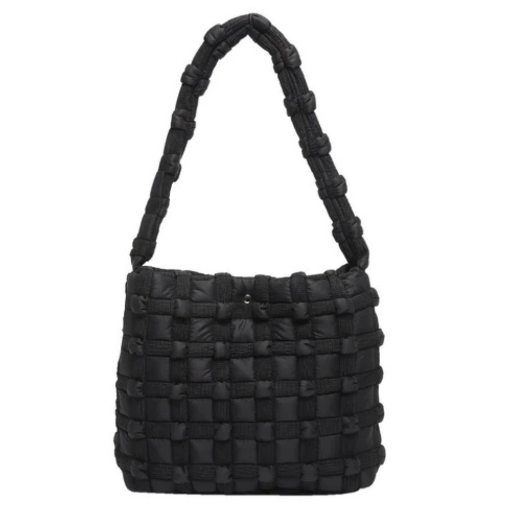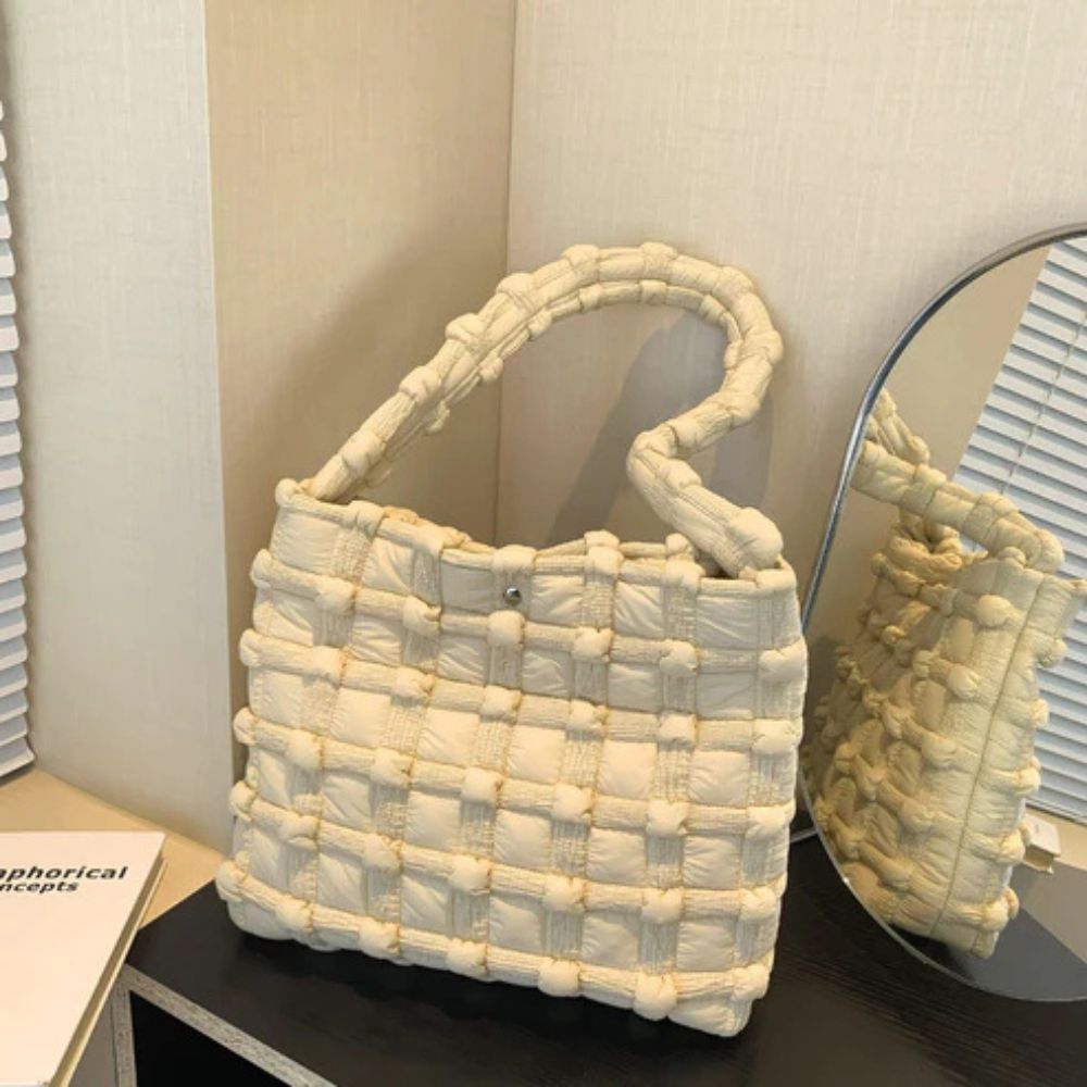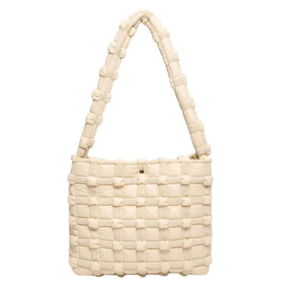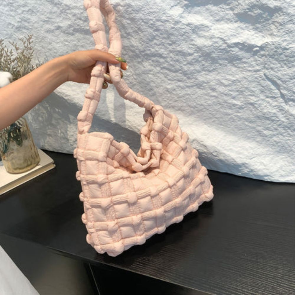The exterior boasts a chic plaid stitch pattern, blending urban simplicity with subtle detailing. Its open outer pocket allows for quick access to your keys or sanitizer, while the single adjustable strap provides comfort and stability on the go.